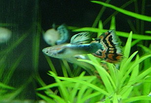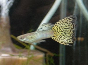 (上のグッピーと比べると、細かい模様が繊細な印象を与えます。男性に人気があります。)