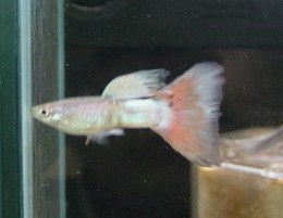 (体色がシルバー色のため、上のグッピーと比べると赤さが目立ちにくい・・・。尾筒が太いので今後、尾びれが大きくなりそうです。)